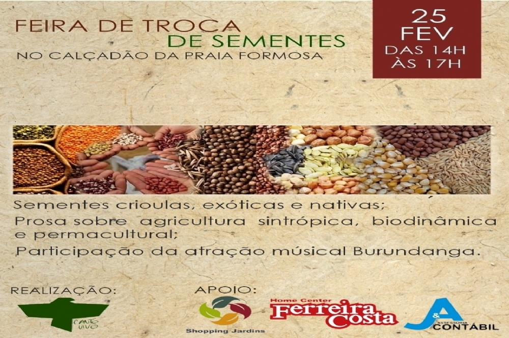 Neste domingo, 25, o Instituto Canto Vivo realiza a Feira de Troca de Sementes, um evento em que agricultores e agroflorestores se reúnem para fazer o intercâmbio de materiais. O encontro acontece na Praia Formosa, das 14h às 17h. As sementes não podem ser geneticamente modificadas.