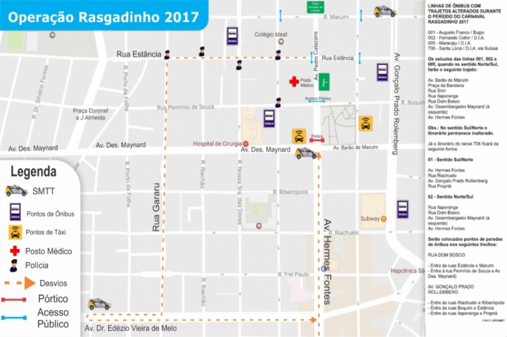 Ao todo, 110 agentes de trânsito atuarão no Rasgadinho, divididos em 22 por dia de evento. O trabalho com foco no evento terá início às 23h da terça-feira, 21, com a montagem dos palcos na avenida Pedro Calazans, entre a Rua Itaporanga e Maruim. Toda a via será isolada para o tráfego de veículos. A via será liberada apenas na quarta-feira de cinzas.