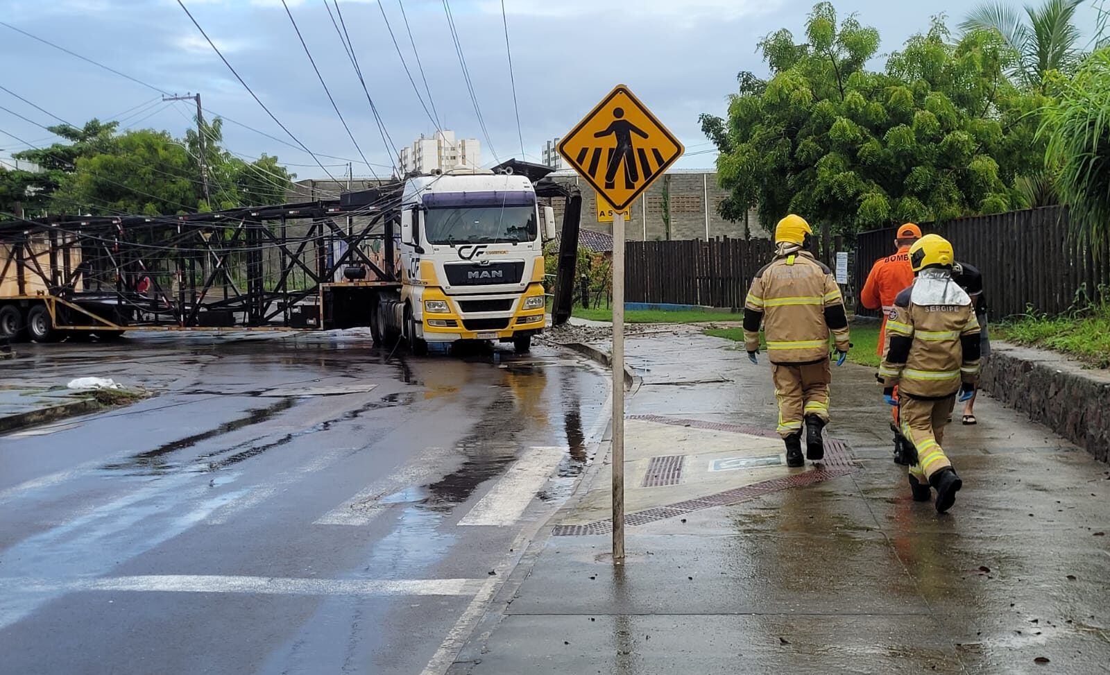 O caminhão havia colidido com um poste, provocando a queda do poste sobre a carreta, gerando risco elétrico na área. Diante da situação, os bombeiros realizaram o isolamento do local para garantir maior segurança até a chegada da concessionária Energisa, que assumiu os procedimentos relacionados à rede elétrica.