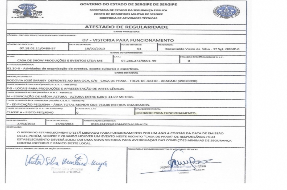 O atestado da Diretoria de Atividades Técnicas do Corpo de Bombeiros consta os itens de cumprimento quanto às normas de segurança. “O Corpo de Bombeiros analisou e aprovou a casa para funcionamento. Foram feitas pequenas modificações como corrimões, placas de sinalização, substituição de extintores de água e pó por extintores ABC e a colocação das luzes de emergência”, esclarece Gustavo Paixão que enfatiza que nesta sexta, 1º, voltará às atividades.