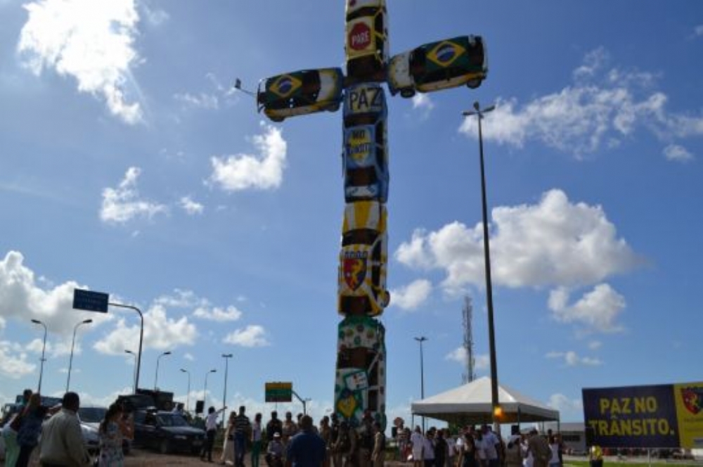 | Cruz feita de veículos lembra os acidentes em estradas |