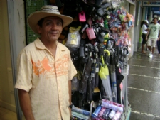 Um dos únicos produtos que obteve um aumento nas vendas no dia de hoje foi o do senhor Edvaldo Avelino. “Hoje eu já vendi várias sombrinhas e guarda-chuvas. Mas eu concordo com o feriado porque a gente tem que ter lazer” diz. Edvaldo Avelino e sua barraca de “sombrinhas”