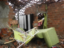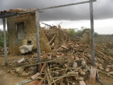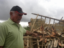 pequeno terreno. “Eu estava sentado na rede olhando a chuva, quando começou a ventar demais. Eu já comecei a ficar desconfiado que pudesse aumentar e então saí da rede um pouco. Não passou nem um segundo e a parede caiu bem em cima da rede”, relata Zé. O agricultor José mostra sua casa destruída por causa da ventania