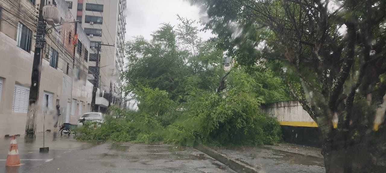 O canal da Avenida Airton Teles, localizada no bairro Santo Antônio, encheu e transbordou, causando alagamento que se estende por toda a via. Além disso, uma queda de árvore bloqueou o trânsito em um trecho entre as ruas Estância com Pacatuba, no centro de Aracaju.