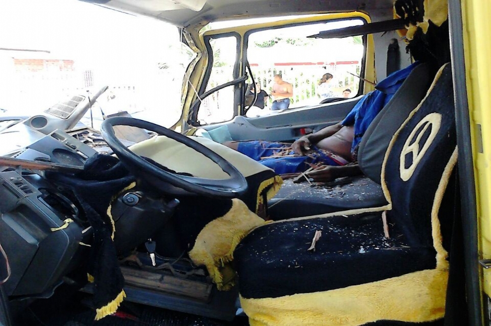 | Caminhão colidiu neste outro. Parte da estrutura de madeira atingiu o rapaz (Foto: Adeilton Santana) |