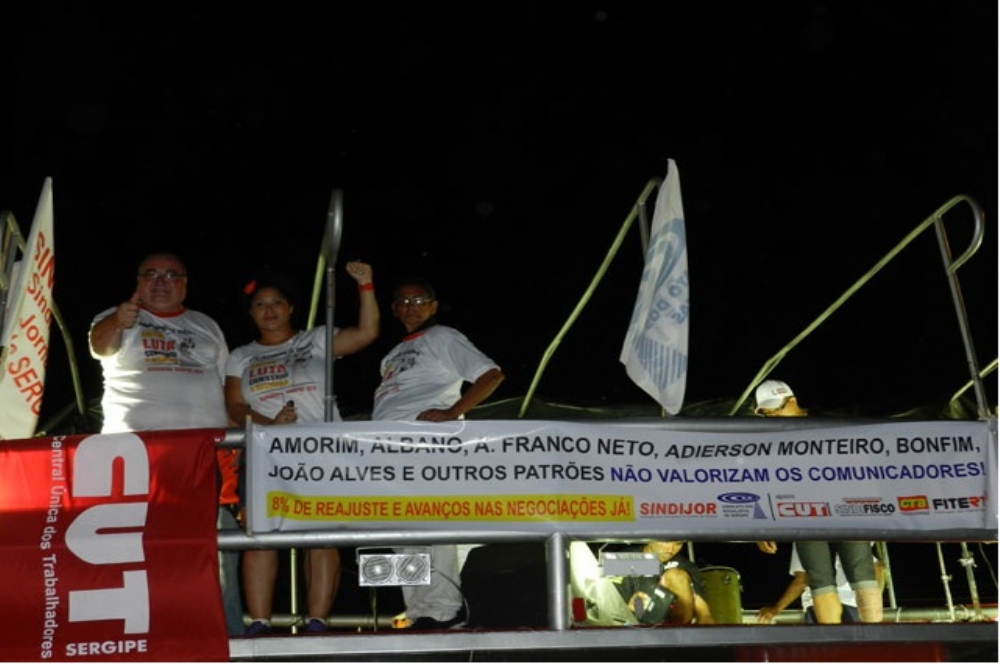 “2012 já se foi e até hoje os patrões da comunicação de Sergipe – Albano Franco, Walter Franco, Augusto Franco Neto, Ricardo Franco, João Alves, Amorim, Adierson Monteiro e outros – enrolam nas negociações salariais com os Jornalistas e Radialistas. Não aceitam avançar nas negociações e as categorias estão sem receber reajuste e sem Convenção Coletiva de Trabalho. Enquanto isso, os patrões fazem festa! Curtem o Pré-Caju enquanto os comunicadores ralam no dia a dia pra levar informação de qualidade aos quatro cantos do Estado e dar lucros aos patrões. Mas esse lucro não é dividido com os trabalhadores. Vai pro Whisky, pro camarão empanado e pras regalias patronais. Para os trabalhadores, nada!!!”, e prosseguia: