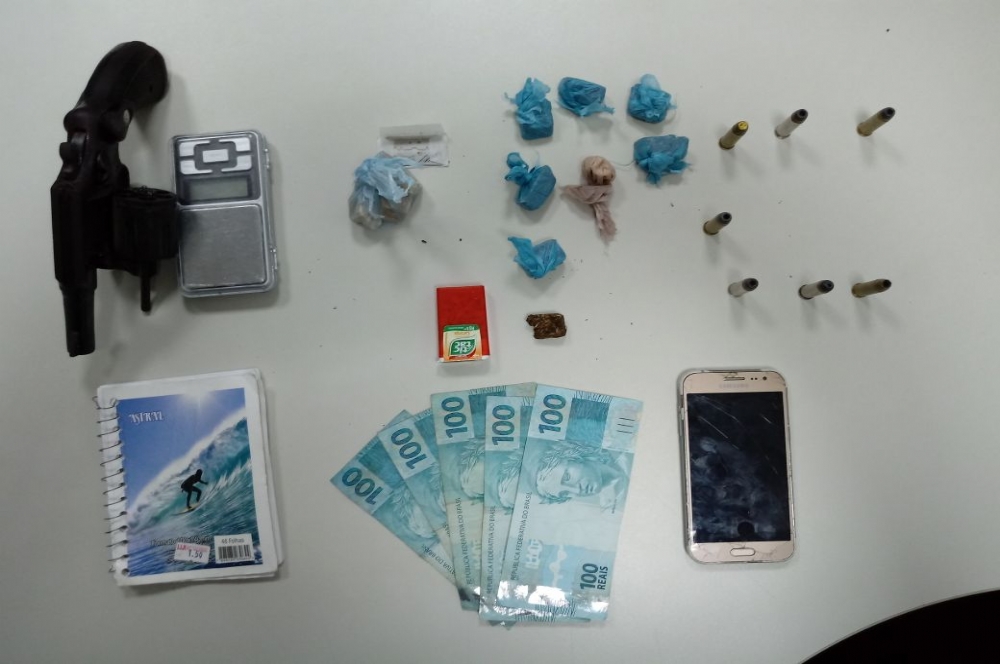 Foram apreendidos um revólver calibre .38, uma pistola calibre 765mm, com dois carregadores e vinte munições, maconha, mais de duzentas pedras de crack e quarenta pinos de cocaína, além de quantias em dinheiro.