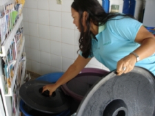 No banheiro, baldes de água substituem a descarga e a água dos filtros sequer passa por processo de fervura antes do consumo. A direção assumiu que não procurou a Deso, mas passou o problema à Secretaria Municipal de Educação. Funcionária da escola mostra os baldes de água