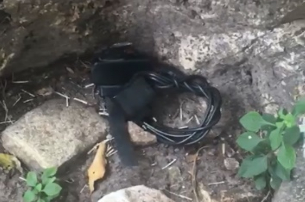 | Tornozeleira lançada no calçadão da praça (Foto reprodução do grupo Informações Policiais) |