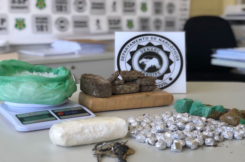 | Entre as drogas apreendidas estão maconha, crack e cocaína; além de pinos vazios e uma balaça de precisão (Foto: SSP/SE) |