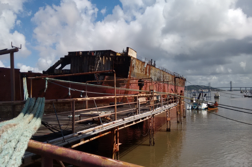 Há dez anos que ele faz parte da paisagem de Aracaju. Ancorado num estaleiro do município de Barra dos Coqueiros desde 2008, sendo facilmente visto por todos que cruzam a Avenida Ivo do Prado, na região Central da cidade, a sucata de um navio graneleiro da empresa H. Dantas começou a ser desmontado em 2016, mas, após um incêndio ocorrido no mesmo ano, o trabalho de desmonte foi interrompido pela Administração Estadual do Meio Ambiente (Adema), para regularização das condicionantes.