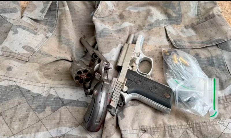 No local, foram apreendidas duas armas de fogo, uma pistola calibre .380 e um revólver calibre .32, além de um colete com identificação da Polícia Civil, uma balaclava e roupas semelhantes às usadas por forças de segurança.