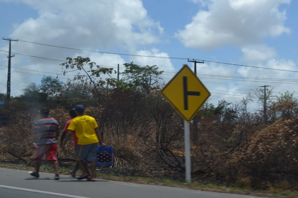 | Transeuntes levam engradados de cerveja pela BR-101 |