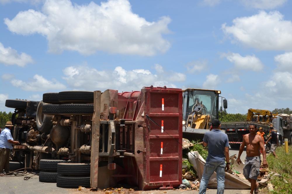 A caçamba da Estre Ambiental com lixo virou na rótula da entrada para a cidade de Nossa Senhora do Socorro. Nas primeiras horas desta manhã o lixo estava sendo retirado por um trator e a área foi sinalizada pela PRF.