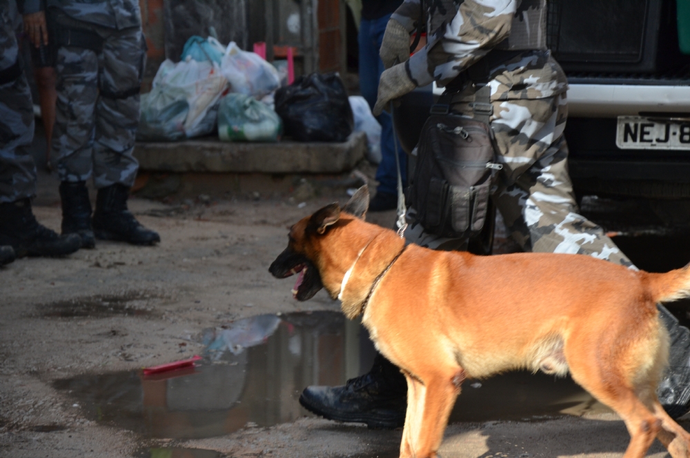 | Cão do Canil do Batalhão de Choque "inspeciona" casas em busca de drogas |
