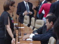 O momento que precedia a eleição era de contatos políticos. Os deputados conversavam entre si ou pelos celulares enquanto uma bateria de fotógrafos e jornalistas esperava pelo momento certo. Apesar da votação, o clima era de calma. O deputado Fabiano Oliveira (PTB) não largava o celular por um minuto e só deu uma trégua ao aparelho para se juntar ao grupo da deputada Ana Lúcia (PT), que conversava com Gilmar Carvalho (PV), pastor Mardoqueu (PL), Jorge Araújo (PSDB) e Ulices Andrade (PSDB).