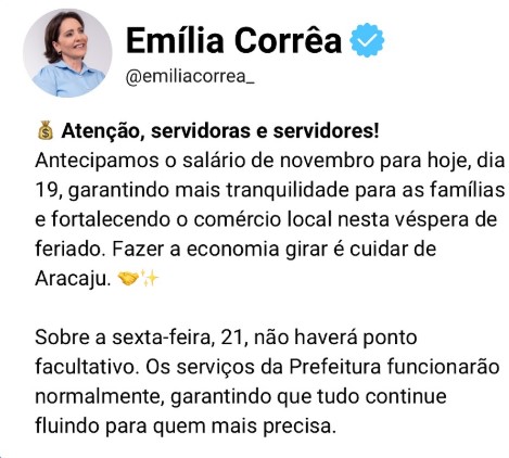 A prefeita de Aracaju, Emília Corrêa (PL), anunciou na manhã desta quinta-feira, 19, a antecipação do salário de novembro para todas as servidoras e servidores municipais. Segundo ela, o pagamento realizado ainda hoje garante mais tranquilidade para as famílias e contribui para o fortalecimento do comércio local na véspera do feriado. “Fazer a economia girar é cuidar de Aracaju”, afirmou a gestora ao comunicar a medida.