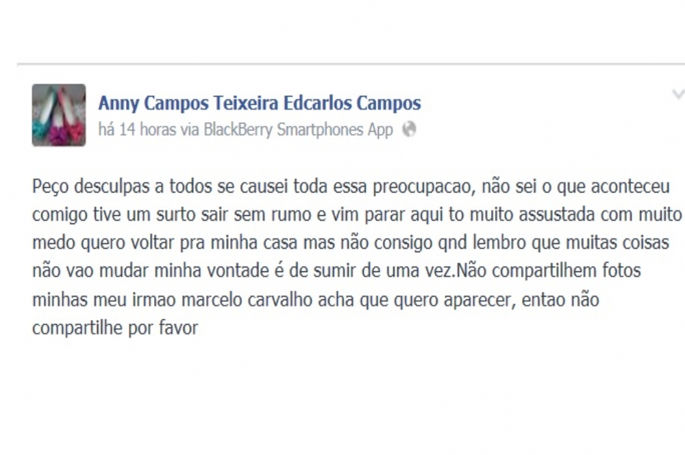 Por meio do Facebook, a empresária pediu desculpas pelo sumiço e explica que teve um surto. “Peço desculpas a todos se causei toda essa preocupacao, não sei o que aconteceu comigo tive um surto sair sem rumo”, escreveu.