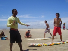 O aluno Luciano Neto, 14, já fez o curso, mas continua freqüentando algumas aulas. “É divertido e faz muito bem pra saúde”, comenta o jovem surfista. Já a novata Larissa Noêmia, 14, está pegando aulas pela primeira vez. “Eu sempre vi as pessoas surfando e tenho muita curiosidade, Quero aprender logo”, comentou animada. Gileno Júnior ensinando, e Luciano neto (bermuda vermelha)