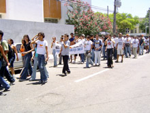 Os estudantes da Universidade Federal de Sergipe e da Universidade Tiradentes, juntamente com diversos grêmios estudantis de escolas dos Ensinos Médio e Fundamental, realizaram uma passeata com saída do Colégio Atheneu manifestando-se contra o aumento da tarifa de ônibus. A passagem, que antes custava R$ 1,30 passou para R$ 1,45 no último mês. João Paulo explicou que procurou o DCE da UFS para se agregar ao evento, porém o Diretório não quis comparecer à manifestação, disse ele. As duas universidades estiveram representadas por alunos e pelo professor Romero Venâncio, presidente da Associação de Docentes da Universidade Federal de Sergipe – Adufs. Carvalho disse que esta foi a segunda manifestação: a primeira aconteceu no dia 22 de dezembro. O presidente informou que o objetivo não é apenas se levantar contra a decisão de aumento, mas propor também o passe livre para os desempregados. Enquanto caminhavam, os estudantes bradavam com um carro de som: “No bolso do trabalhador, esses R$ 0,15 vão fazer diferença e nós estudantes temos que nos levantar contra essa decisão da Prefeitura em concordância com o sindicato dos donos das empresas de ônibus”. Enquanto isso, alguns policias de trânsito seguiam a passeata para organizar o trânsito no local. SMTT – De acordo com Jairo Alves, assessor de comunicação da SMTT, a empresa não foi procurada pelos estudantes antes de realizar a manifestação. “Pelo menos os estudantes deveriam procurar o superintendente, Bosco Mendonça, antes de fazerem uma passeata deste tipo”, explicou o assessor. Segundo ele, as planilhas estão à disposição de quem desejar ter acesso aos números. Para Jairo, o aumento ficou abaixo do solicitado pelas empresas e o valor estipulado corresponde a mais de três meses de estudo: “As empresas pediram R$1,65 e a SMTT deu R$1,45. O Conselho que analisou as planilhas de custo é composto por secretários do município e por um representante da população, um vereador. Ele se reuniu, observou as planilhas e participou das reuniões antes de ser definido o acréscimo”, disse Jairo. O assessor explicou que quem tiver alguma dúvida quanto à lisura do processo, basta solicitar uma audiência com Bosco Mendonça. Quanto à qualidade do transporte público na cidade, Jairo disse que com o processo de licitação, serão comprados ônibus mais adequados para oferecer mais conforto aos usuários: “Dentro de 60 dias, sai o edital, e com ele, serão comprados ônibus com ar-condicionado e mais baixos, para facilitar o acesso do idoso. Ainda esse ano o processo deve estar completo”, informou. Por Wilame Amorim Lima