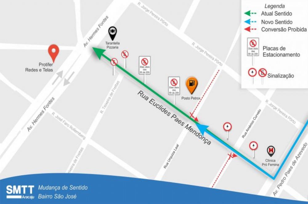 Com o objetivo de melhorar a mobilidade urbana, a Superintendência Municipal de Transportes e Trânsito (SMTT) de Aracaju fará uma mudança de circulação em um trecho da Rua Euclides Paes Mendonça, no Bairro São José. A alteração começa a partir da manhã desta quinta-feira, 9.