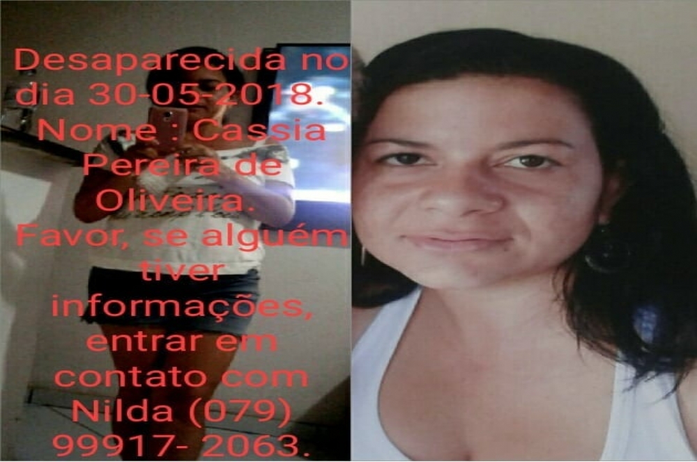 Família moradora do conjunto Sol Nascente está em busca de Cássia Pereira de Oliveira, 41, que desapareceu no dia 30 de maio após sair da casa do pai no povoado Cabrita, em São Cristóvão. Segundo um dos irmãos, Tarcísio Oliveira, Cássia estava com uma mala de roupas no dia do desaparecimento e a última vez que foi vista foi às 11h da terça passada.