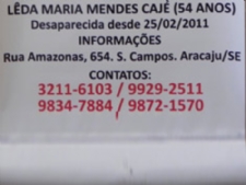 Quem tiver notícias do paradeiro de Lêda Maria Mendes Cajé, pode colaborar com a família entrando em contato através dos números 3211-6103/9929-2511/9834-7884/9872-1570.Por Alcione Martins