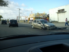 O internauta Thiago Leite registrou o resultado de um acidente às 6h40 desta quinta-feira, 25, na avenida Tancredo Neves. Segundo ele, o veículo modelo corsa colidiu contra um poste que caiu na via, deixando apenas uma faixa transitável.