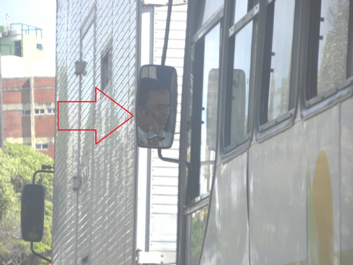O motorista de ônibus falando ao celular