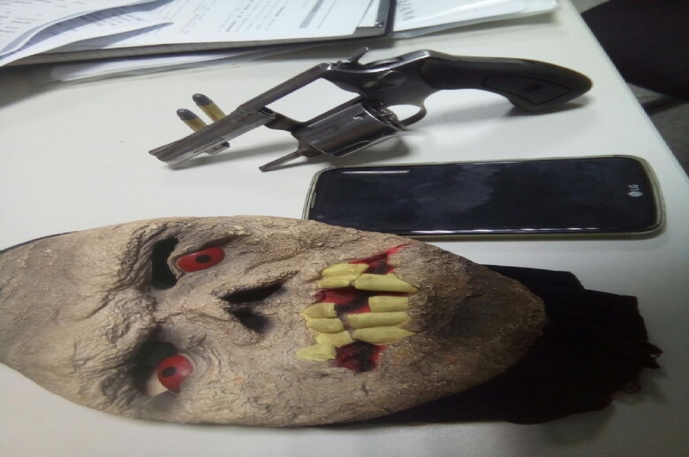 Durante a abordagem foi encontrado um revólver calibre .38 com duas munições intactas do mesmo calibre e uma máscara que servia para evitar a identificação dos suspeitos.