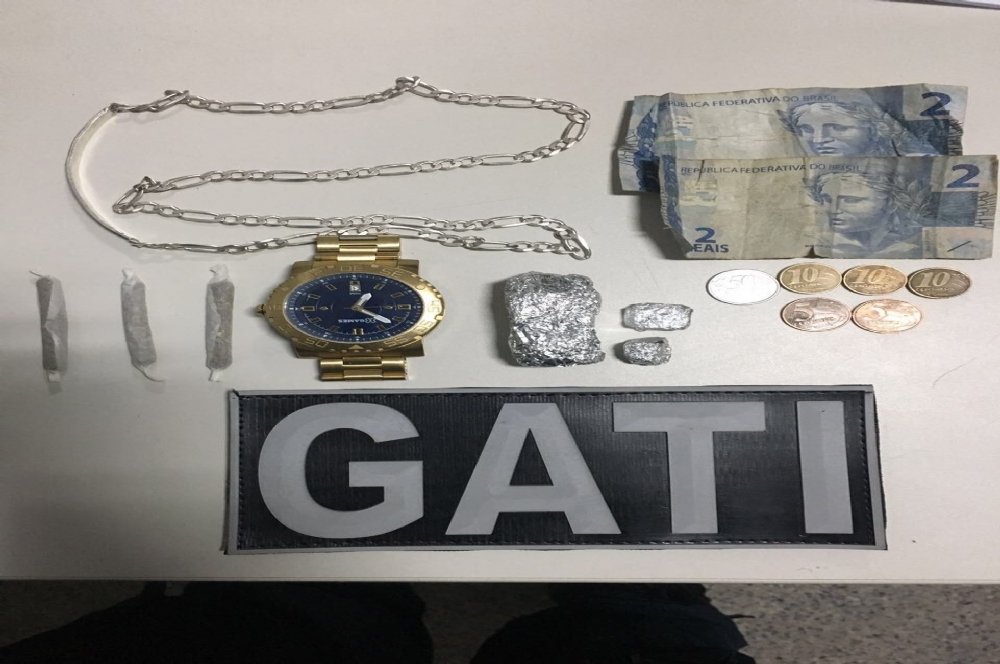 No domingo, 03, o GATI durante patrulhamento ostensivo notou três pessoas em atitudes suspeitas, que tentaram se evadir diante da aproximação policial, o indivíduo de nome Wallyson Ribeiro Barreto, foi preso em flagrante, após busca pessoal, com uma grande trouxa e duas pequenas de maconha.