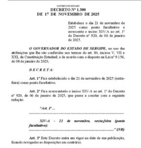 O Governo de Sergipe publicou nesta terça-feira, 18, o Decreto nº 1.300/2025, que estabelece ponto facultativo na próxima sexta-feira, 21 de novembro, em todo o território estadual. A medida altera o Decreto nº 920/2025, com a inclusão do inciso XIV-A no artigo 1º.