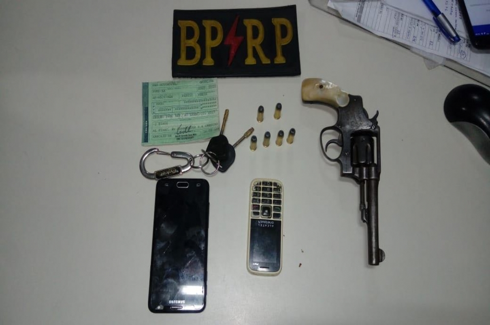 Já nas proximidades da Igreja Espírito Santo, na avenida Juscelino Kubitscheck, os suspeitos, ocupantes de um Ford KA foram interceptados. Nas buscas, os policiais militares encontraram, no interior do automóvel, um revólver calibre 32 com seis munições. O suspeito também possuía um telefone celular, que está sendo rastreado, foi preso e encaminhado para a Delegacia Plantonista Norte, onde foram realizados os procedimentos legais de flagrante por porte ilegal de arma.