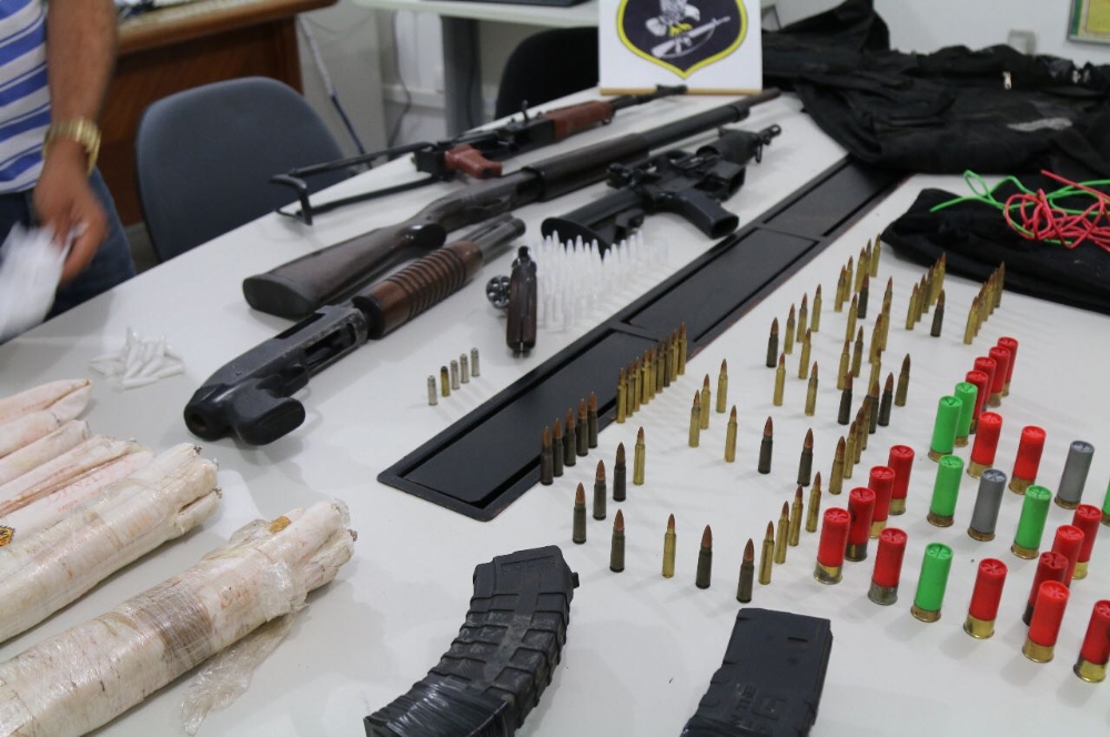 | Explosivos, armas de guerra e dinheiro foram apreendidos (Foto: Divulgação/SSP) |
