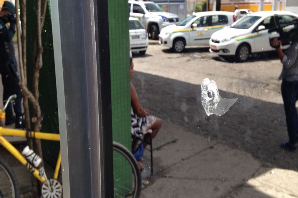 | Um dos disparos perfurou o vidro da Unidade de Atendimento (foto: Portal Infonet) |
