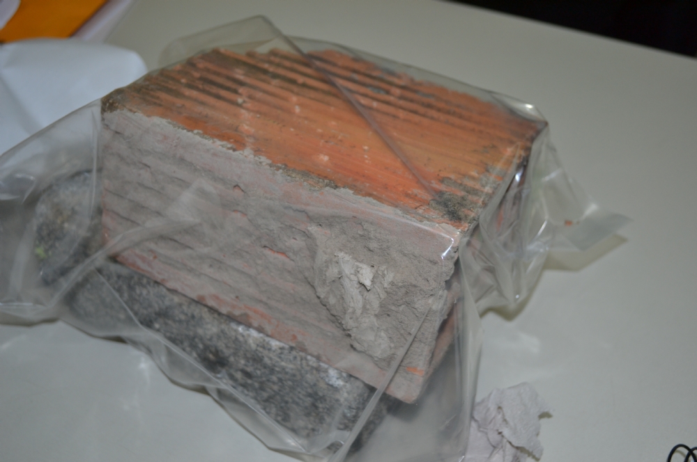 | Paralelepídedo e tijolo utilizados para depredar viatura (Foto: Portal Infonet) |