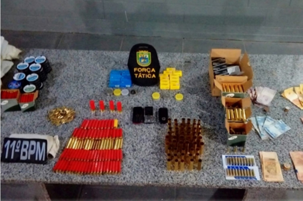 Celestino foi pego com caixas de munições completas e diversos cartuchos de escopeta e munições de diversos calibres, além da quantia de mais de R$1.500 em cédulas de diversos valores.