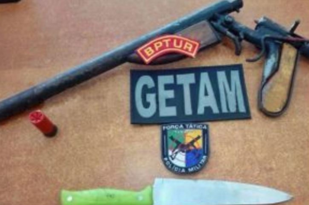 Uma ação conjunta das equipes do Grupamento Especial Tático de Motos (Getam) e da Rondas Ostensivas com Apoio de Motocicletas (Rocam) do Batalhão de Policiamento Turístico (BPTur) resultou nas prisões de dois homens e na apreensão de uma escopeta calibre 12, de fabricação caseira, e uma faca peixeira. O fato aconteceu no final da manhã desta quarta-feira, 3, no bairro Aruana, na zona de expansão de Aracaju.