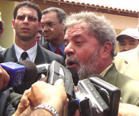 Agora, em um palanque montado na Aruana, estão o presidente Lula, Marcelo Déda, o ministro das Cidades, Olívio Dutra; o vice-prefeito, Edvaldo Nogueira e outros assessores do presidente.