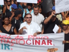 Com a intenção de cobrar agilidade no julgamento de oito processos que tramitam na Justiça Eleitoral, populares foram até a porta da prefeitura da cidade. “Estamos fazendo uma manifestação pacífica, por que acreditamos na Justiça e esperamos que ela possa julgar tais processo”, afirmou o professor Givaldo Garção. Oposição Liderado pelos cinco vereadores de oposição, os manifestantes também pediam esclarecimentos em relação ao dinheiro público. “Gostaríamos de saber para onde estão indo os cinco milhões de reais de arrecadação municipal? Hospitais sem condições de atendimento, creches em situação precária, as pessoas da nossa cidade passando fome morando no lixão, além de construções que nunca são feitas, a exemplo do ginásio de esporte”, questionou a vereadora Maura Gicélia (PDT). Segundo a vereadora Maria José Gomes (PSB), o prefeito Etelvino Barreto Sobrinho não tem diálogo com os vereadores. “Ele não senta com os vereadores para conversar. O prefeito de Rosário mora em Aracaju, como é que uma pessoa pode vivenciar os problemas da cidade dessa maneira?”, indagou Maria José. Situação Domingos também ressaltou que o grupo de oposição liderado por Wagner Quintela mente em relação aos números da prefeitura. “Eles alegam que a arrecadação é nove, dez ou até doze milhões de reais, onde na verdade é de R$ 2,5 a 3 milhões” pontuou. O secretário de Comunicação, quando questionado a respeito dos problemas na saúde e educação, além de outros colocados pelos manifestantes, afirmou que a oposição ao prefeito Etelvino tenta falsificar a imagem da administração. “São problemas que não existem! Se existir algum problema, estamos aqui para corrigir”, afirmou Domingos. População Jussara Viana, 52 anos, moradora de Rosário, participou da manifestação para pedir justiça. “Estou aqui porque quero justiça. Estou desempregada e não sei a quem recorrer na hora da dificuldade. Fui até a prefeitura para tentar receber uma cesta básica e eles negaram porque não votei nele na eleição passada” disse Jussara. Já dona Eliana dos Santos, 44 anos, que tem um neto de sete anos, com problemas de saúde, participou da manifestação com um pedido de socorro. “A minha casa está caindo os pedaços, meu neto não pode ficar lá dentro porque o problema dele é de pulmão, já perdeu um e pode perder outro com as condições da casa onde moramos. Não posso contar com a ajuda da prefeitura, porque não votei neles.” comentou Eliana. Para dona Maria de Fátima, que tem nove filhos, a única opção para sustentar a família é trabalhando no lixão. “Às vezes penso em sair daqui, mas choro de desespero pensando que a situação pode piorar ainda mais” lamentou Fátima, que ganha R$150 por mês, catando latas e plásticos no lixão há nove anos.