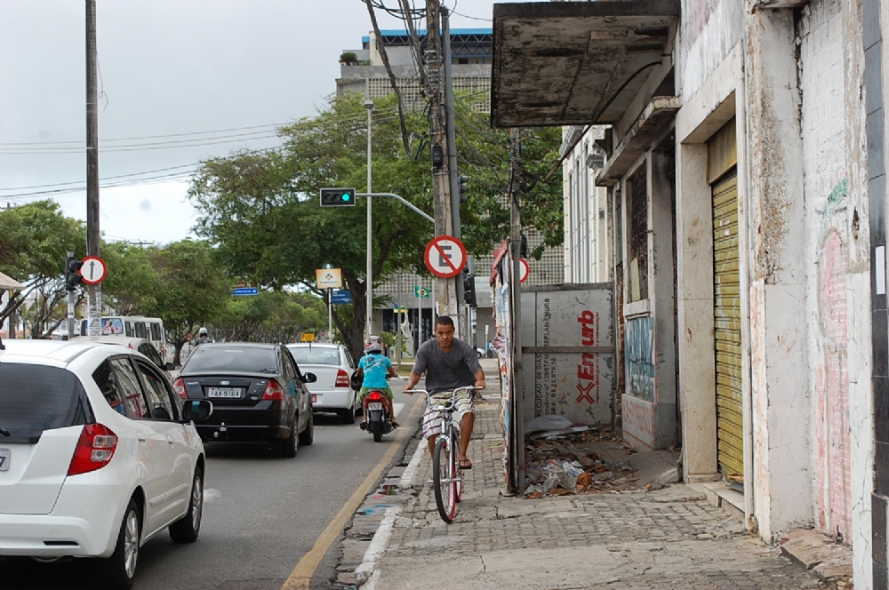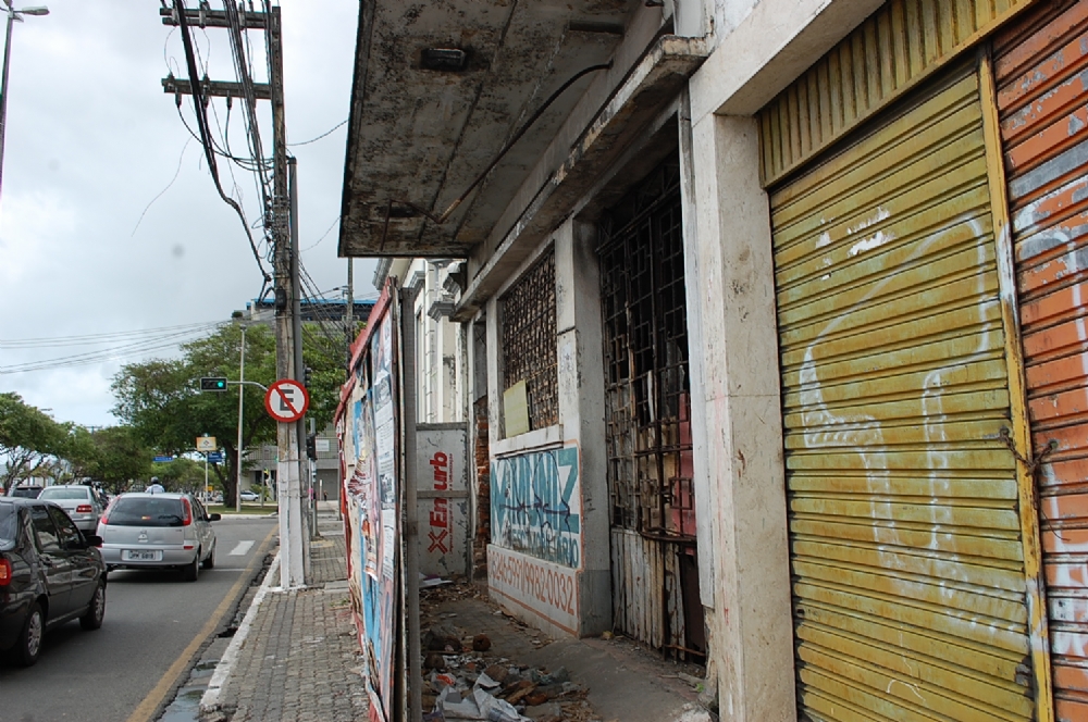 Na avenida Rio Branco, a marquise de um dos antigos prédios, onde funcionou a sede do Diário Associados, foi condenada pela Defesa Civil e vândalos retiraram a estrutura de madeira que escoravam o empreendimento.