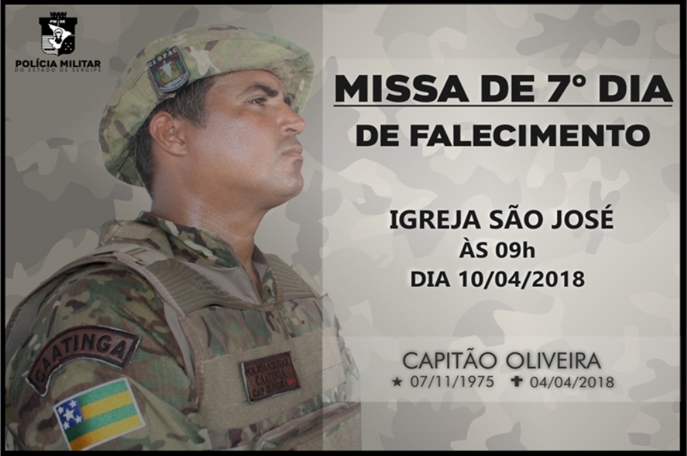 A Polícia Militar do Estado de Sergipe convida a Corporação e a sociedade civil para a Missa de 7º Dia do capitão Manoel Alves de Oliveira Santos, falecido na quarta-feira, 4, durante uma emboscada ocorrida entre os municípios de Monte Alegre de Sergipe e Porto da Folha, no Alto Sertão Sergipano.