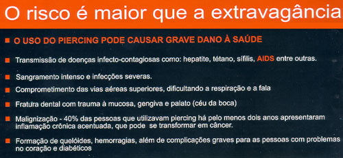 “O risco é maior que a extravagância”, esse é o mote da campanha de conscientização lançada hoje pelo Ministério Público Estadual em parceria com os Conselhos de Pediatria, Odontologia, Educação, Vigilância Sanitária entre outros órgãos. O objetivo é esclarecer aos pais e adolescentes os riscos envolvidos na colocação de piercings e tatuagens em ambientes insalubres.