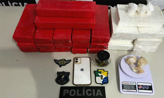 Os militares se deslocaram até o endereço indicado e, durante as buscas, apreenderam mais de 19 kg de maconha fracionados em vários tabletes, três embalagens plásticas contendo 79 g de cocaína e quatro embalagens plásticas com 64 g de crack.