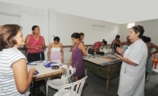 Mulheres têm aula no galpão onde as famílias estão instaladas