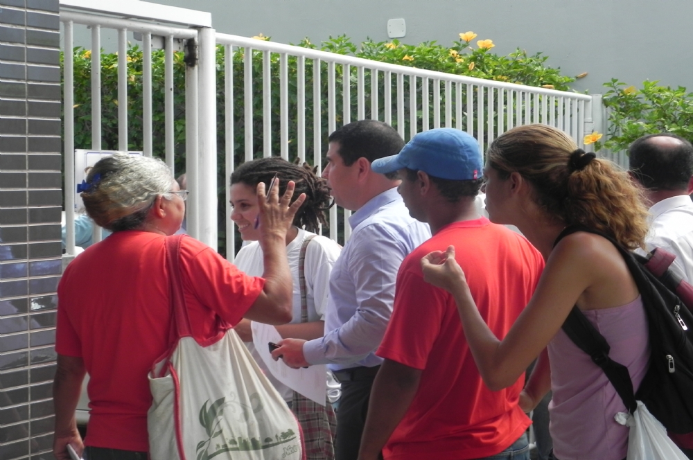 “Aqui estão apenas as famílias do 17 de Março, que desocuparam hoje cedo o prédio do INSS. Elas vieram reivindicar ao superintendente da Caixa, um projeto de moradia popular, já que é o Governo Federal que libera os recursos”, enfatiza.