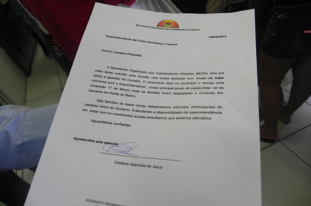 O assessor recebeu dos representantes dos Sem Teto, um documento, dando conta de que “as famílias despejadas do 17 de Março, são participantes do Cadastro Único do Governo e precisam de moradia, pois estão morando em barracos”e prometeu protocolar o pedido, convencendo os manifestantes a desocuparem o prédio e aguardarem do lado de fora da agência.