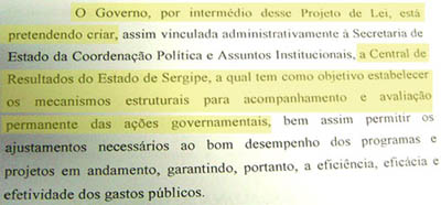 NÚMEROS – O primeiro projeto trata da criação da Central de Resultados do Estado de Sergipe. A Central seria uma espécie de órgão que teria por função acompanhar a eficácia de projetos e programas do Governo. Porém, cabe observar duas coisas: a primeira é que cada Secretaria tem a obrigação de acompanhar o desenvolvimento de seus projetos e a segunda é que cada uma das 24 Secretarias de Estado terão acrescentados em seus quadros mais 6 cargos de comissão de nível CCE 11, traduzindo, um salário de mais de R$ 4 mil para cada uma das vagas.