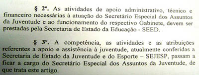 Uma das proposições mais polêmicas, entretanto, é o que cria os cargos de secretário Especial de Políticas para as Mulheres, a Secretaria Especial de Assuntos da Juventude e a Secretaria Particular do governador do Estado, bem como um Gabinete. O ponto a se observar, nesse caso, é que a Secretaria de Esportes deixa de ser responsável por assuntos ligados à Juventude, mas estes assuntos ganham uma Secretaria especial ligada à Secretaria de Educação. Além de aumentar os gastos, a vinculação à Educação restringe o campo de atuação do novo órgão.