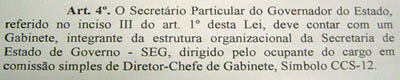 Já a Secretaria para Assuntos da Mulher ficará vinculada à Secretaria de Combate à Pobreza e o secretário Particular do Governador do Estado ganha um gabinete e um cargo de símbolo CCS 12: